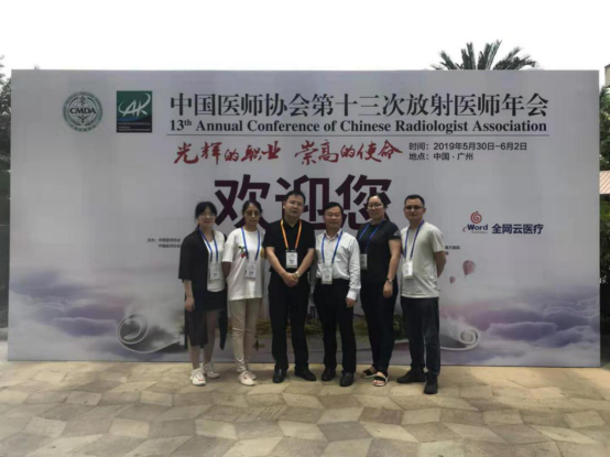 图5 丁忠祥主任和韩志江主任带领单嫣娜副主任医师、刘学竞主治医师、二年级优秀住培学员王伊辉(右一)和一年级优秀学员谢胜宇(左一)参加中国医师协会第十三届放射医师年会