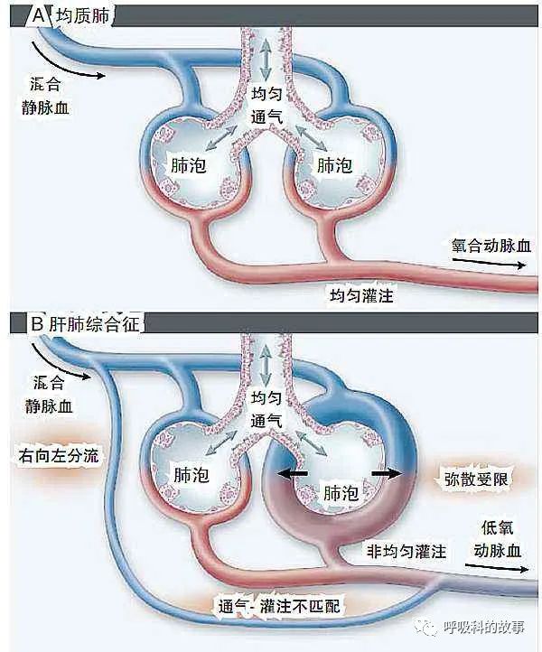 但是在肝硬化失代偿期的病人中,由于肝脏灭活某些扩血管激素功能下降,引起这些扩血管激素含量增加,那么导致血管扩张,特别是下肺的血管扩张更明显(原因是下肺的血管密度更高)。所以当病人坐位和立位情况下,由于重力作用,血流基本上只在下肺流动,中上肺就没有什么血流,这样子肺中上部分肺泡里的氧气就不能进入血管里。这就好比高层的房子底层的水管漏了或者管子变粗了,而高层的管子还是原来的样子,导致高层就没有水了。