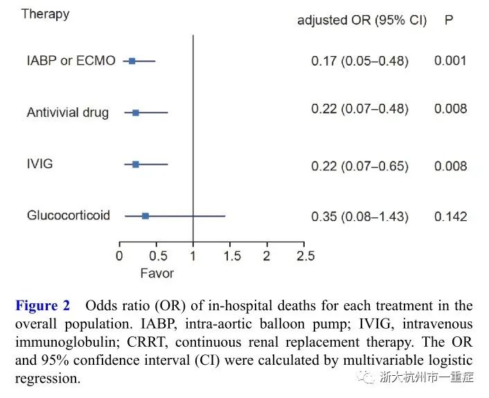 为了进一步探讨单个治疗的效果,我们测试了IABP、抗病毒药物、IVIG和糖皮质激素的使用与预后的关系。结果表明IABP或/和ECMO应用、抗病毒药物和IVIG给药可显著降低住院死亡率(IABP或ECMO为18.7%比38.7%;校正or为0.17;95%可信区间为0.05-0.48;P=0.001),抗病毒药物为20.8%对38.8%;校正or为0.22;95%CI为0.07-0.65;P=0.008;静脉注射免疫球蛋白为21.0%对38.0%;校正or为0.22;95%可信区间,0.07–0.65;P=0.008。另外,糖皮质激素的应用有明显的降低住院死亡率的趋(24.1%vs.37.5%;校正OR,0.35;95%CI,0.08-1.43;P=0.142),这些发现表明早期联合这些方法和技术有助于提高临床疗效。