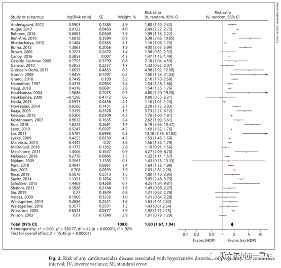与HDP相关的任何心血管疾病的风险估计汇总在图2中。纳入的研究报告的这种相关性的相对危险度在0.88到13.18之间。对这些风险估计进行Meta分析得出的汇总RR为1.8(95%CI1.67-1.94),具有显著的异质性(I2=92%,p<0.001)。