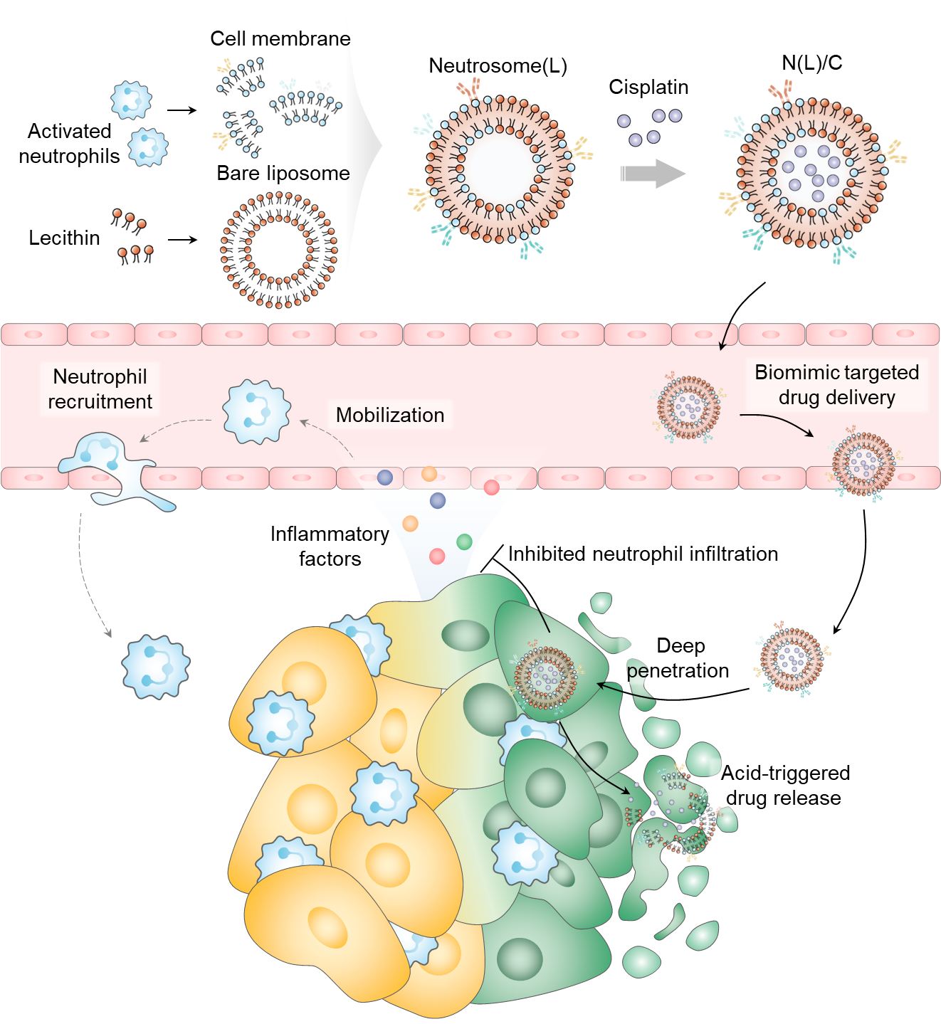 严重的毒副作用仍然是当前临床肿瘤化疗面临的主要挑战。肿瘤靶向药物递送系统是提高靶组织浓度、减少药物全身分布、克服化疗全身毒性的可靠解决方案。然而,另一方面,肿瘤免疫微环境异质性可促进肿瘤细胞耐受而降低化疗的疗效,其中,中性粒细胞扮演着重要角色。肿瘤细胞通过分泌的炎症因子吸引外周循环中的中性粒细胞,而被吸引的中性粒细胞沿着炎症因子的趋化梯度迁移,并通过细胞表面粘附分子之间的相互作用渗出血管屏障到达肿瘤微环境,成为肿瘤相关中性粒细胞(TANs),并主要呈现促肿瘤表型。其中,细胞膜在中性粒细胞炎症趋向和肿瘤组织浸润中起到关键作用。根据这些现象,本研究利用脂多糖刺激来活化中性粒细胞,并提取其细胞膜与脂质体嵌合得到一种仿中性粒细胞纳米载体(Neutrosome(L))。Neutrosome(L)继承了中性粒细胞的肿瘤靶向能力,并能够穿透至肿瘤组织深部,显著提高所携载的顺铂在肿瘤组织的分布与累积。更重要的是,Neutrosome(L)可以借助中性粒细胞膜上丰富的细胞因子受体中和炎症因子并占据部分细胞结合位点,抑制中性粒细胞向肿瘤组织的浸润,从而增强顺铂的抗肿瘤疗效。因此,负载顺铂的Neutrosome(L)在荷瘤裸鼠上表现出显著的抗肿瘤作用,降低了全身药物毒性,并将荷瘤裸鼠的中位生存时间延长至64天,为抗肿瘤化疗提供了一种减毒增效的策略。