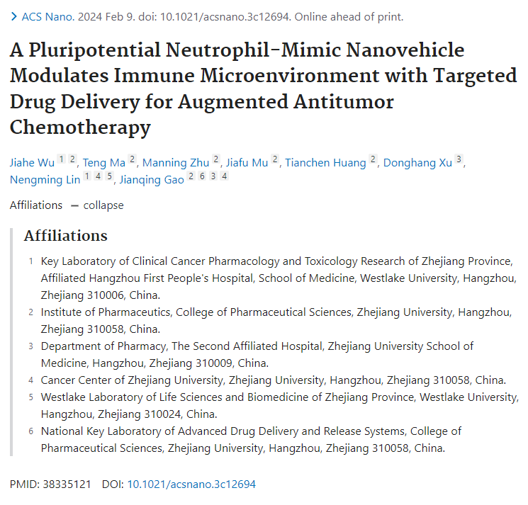 发布时间: 2024-04-11近日,西湖大学医学院附属蜜桃直播 林能明教授团队与浙江大学药学院高建青教授团队合作在ACS Nano(IF: 17.1,中科院1区)上发表了题为A Pluripotential Neutrophil-Mimic Nanovehicle Modulates Immune Microenvironment with Targeted Drug Delivery for Augmented Antitumor Chemotherapy的研究论文。严重的毒...
